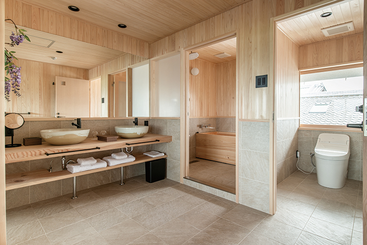 Hinoki cypress bath and rain shower, hot-water washing toilets, air-conditioning and heating (all rooms have heated floors)